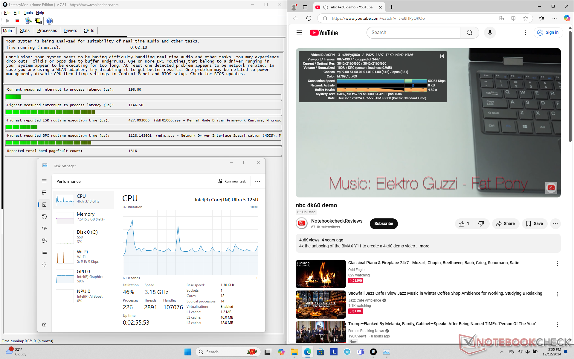 在运行 Prime95 压力测试时,CPU 会升至 3.2 GHz、48 W 和高达 100 C,持续时间仅约 30 秒。U 系列处理器无法长时间维持较高的 Turbo Boost 时钟,但这也意味着要求更高的 Core Ultra 7 155H 配置可能会运行得更热或更响,或面临更严重的节流风险,因为我们的 U 系列 CPU 在负载下已经相当热了。