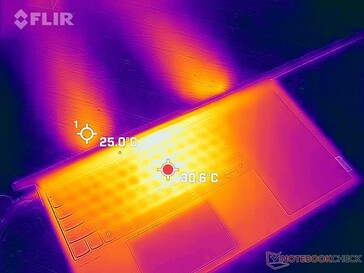 即使在运行苛刻的负载时,表面温度也比预期的低。热点在顶部和底部分别只有约33摄氏度,而50摄氏度或更高的温度在 LG Gram 17在类似条件下的温度为50℃或更高。宽21:10长宽比的较大表面积对整体温度发展有积极影响。