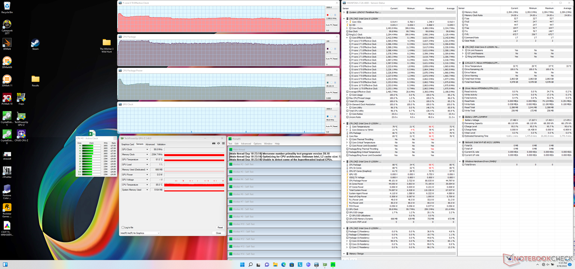 当运行Prime95对CPU施加压力时,时钟频率和电路板功耗将分别飙升至3.6 GHz和80 W,仅持续几秒钟,核心温度达到98 C。时钟频率和电路板功耗将迅速下降到3 GHz和60 W,最终分别稳定在2.8 GHz和52 W,以保持核心温度略低于90 C。