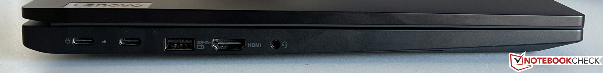 联想提供了 HDMI、USB-C 和 USB-A 接口,您不需要任何适配器,但这些标准只是最低标准。两个 USB-C 端口中只有一个支持 3.2 Gen.2 标准,而且没有 USB 4.0 的迹象。HDMI 输出也仅限于旧的 1.4b 标准,因此如果可能的话,您应该通过 USB-C 连接外部高分辨率屏幕。尽管机身较大,但没有读卡器。
