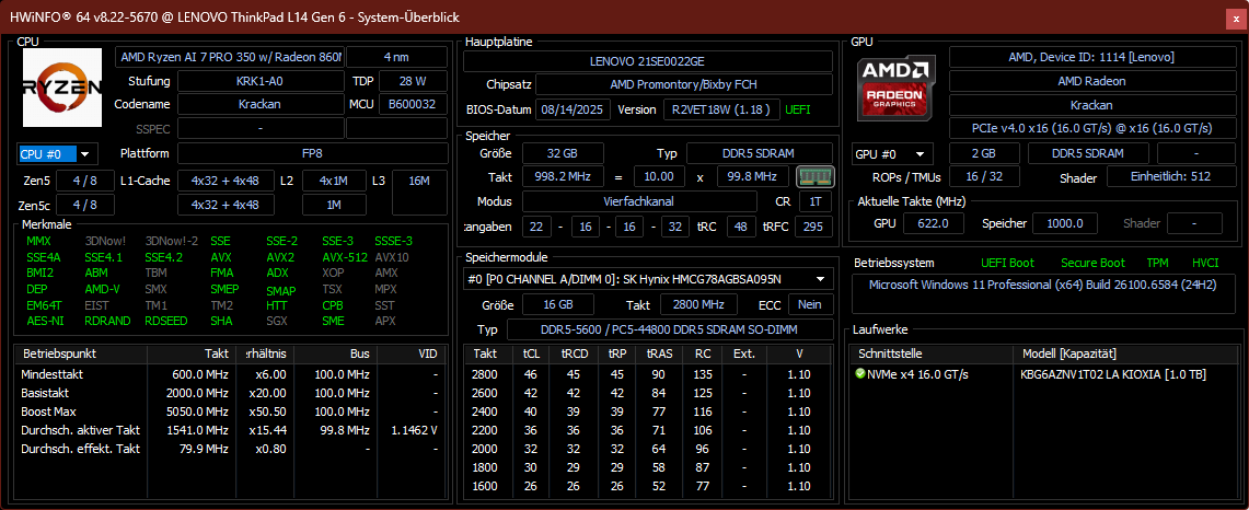 | Lenovo ThinkPad L14 Gen 6 21SE0022GE Ryzen AI 7 PRO 350, Radeon 860M, Kioxia BG6 KBG6AZNV1T02, IPS LED, 1920x1200, 14" | Lenovo ThinkPad L14 G5 21L50014GE R5 7535U, Radeon 660M, Lenovo UMIS AM6A0 RPETJ512MKP1QDQ, IPS LED, 1920x1200, 14" | Asus ExpertBook PM3406 Ryzen AI 7 350, Radeon 860M, Western Digital PC SN5000S SDEQNSJ-512G-1002, IPS, 1920x1200, 14" | Dell Pro 14 Plus PB14255 GH77W Ryzen AI 7 PRO 350, Radeon 860M, Micron 2500 1TB MTFDKBA1T0QGN, IPS LED, 1920x1200, 14" | HP EliteBook 6 G1q 14 SD X Plus X1P-42-100, Adreno X1-45 1.7 TFLOPS, Samsung PM9A1 MZVL2512HCJQ, IPS, 1920x1200, 14" | Lenovo ThinkPad E14 Gen 7 21U2002QGE Core Ultra 5 228V, Arc 130V, Samsung PM9C1b MZVL81T0HFLB-00BH1, IPS, 2880x1800, 14" | Average AMD Radeon 860M | Average of class Office | |