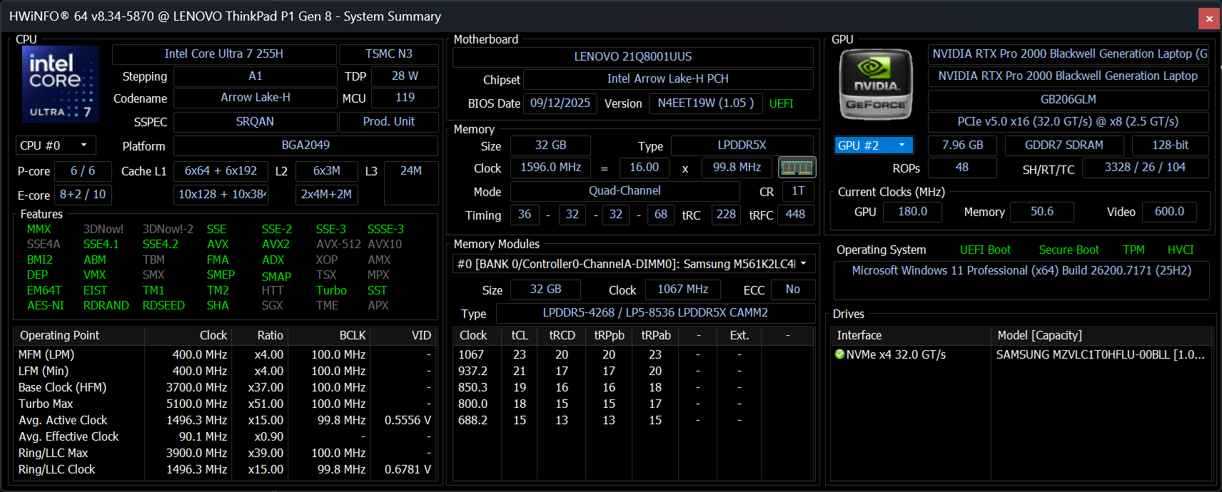 | Lenovo ThinkPad P1 Gen 8 Intel Core Ultra 7 255H ⎘ NVIDIA RTX PRO 2000 Blackwell Generation Laptop ⎘ 32 GB Memory, 1024 GB SSD | Amazon: $4,299.00 List Price: 2000 USD | 1.9 kg | 20.6 mm | 16.00" 3200x2000 236 PPI Tandem OLED | |