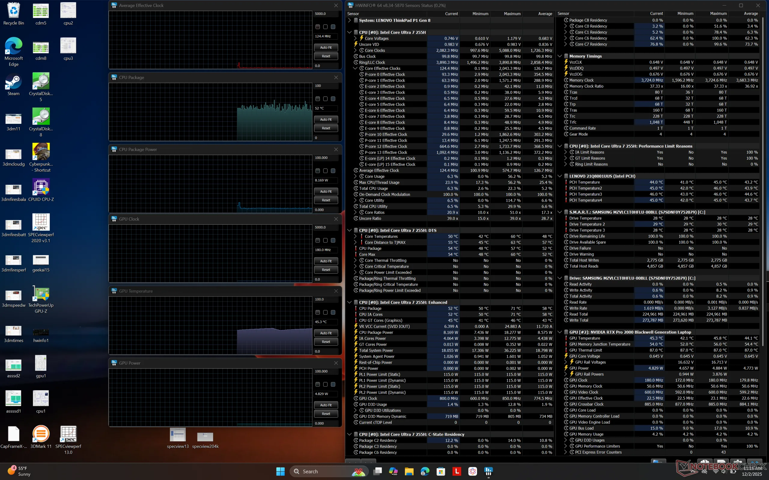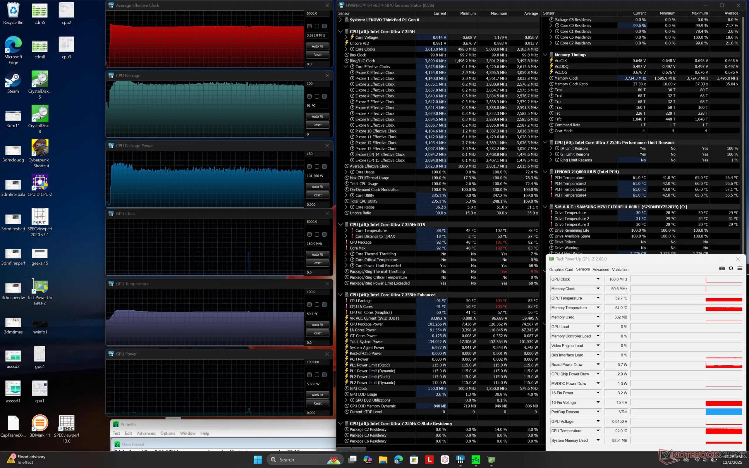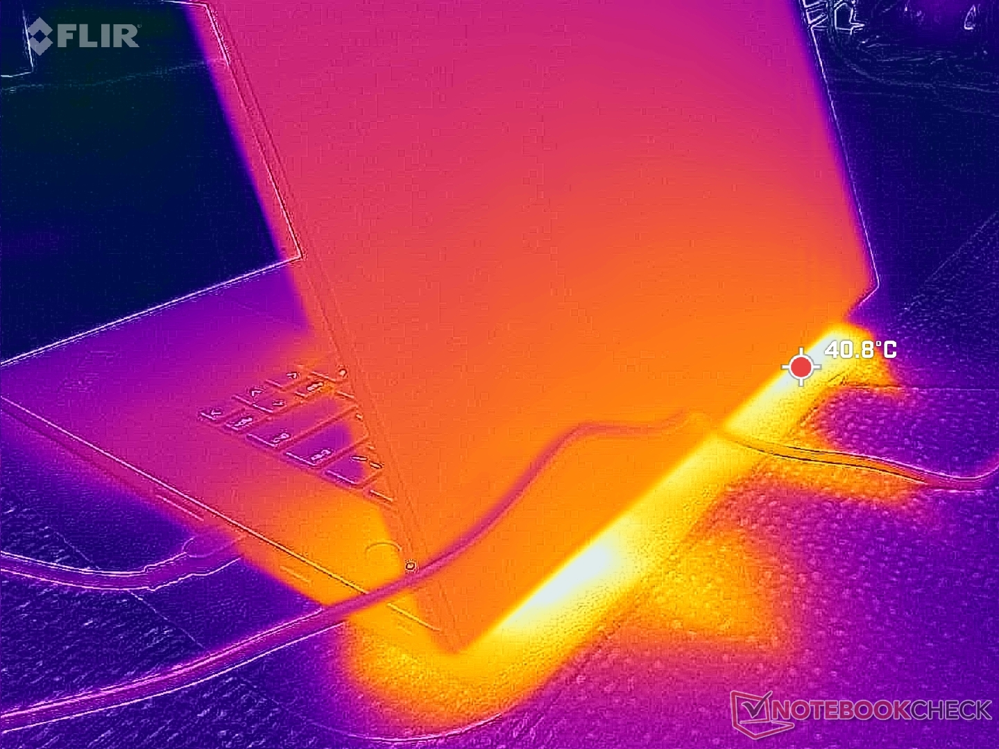 表面温度的变化是对称的,当运行 Prime95 或 FurMark 等要求非常苛刻的负载时,键盘中心附近的热点温度可达 40 C 至 45 C。考虑到纤薄的机箱设计,这一结果比预期的要低。去年的 ThinkPad P1 7 代相比之下,其表面温度更高,这可能是由于其较高的 170 W 功率包络线造成的。