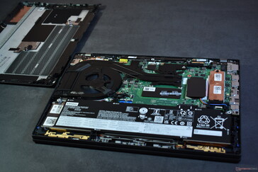 与联想 ThinkPad T14 G4 不同的是,这里的内存是完全焊接下来的。相比之下,英特尔新款 ThinkPad P14s Gen 5 提供了可升级内存。对于 P14s G4 来说,至少 M.2 2280 固态硬盘是模块化的,但遗憾的是只有一个插槽--尤其是对于工作站来说,第二个固态硬盘将是一笔巨大的财富。Wi-Fi 模块也是焊接的,不过有一个开放的 M.2 2242 插槽可用于 WWAN 模块。此外,旋入式电池可以轻松更换,冷却系统也可以轻松清洁。所有这些组件都可以通过底盖接触到,底盖由 7 颗螺丝和背面的几个夹子固定。