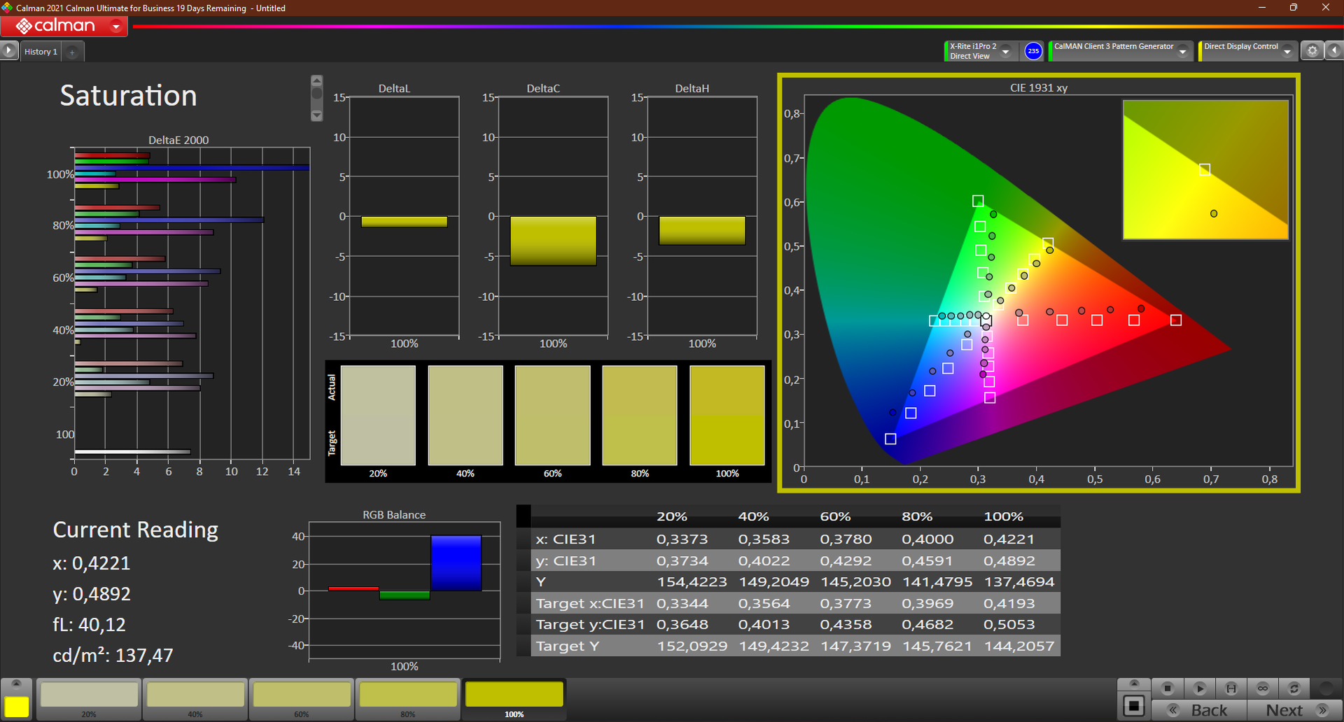 280尼特左右的亮度并不理想,但在室内仍可接受。953:1的对比度以及0.32的黑值也是可以的。校准的结果是更丰富的黑色,我们也能够将相应的DeltaE灰度值从5.3降低到一个良好的0.9。然而,Delta E色彩值仍然很高,为4.5。