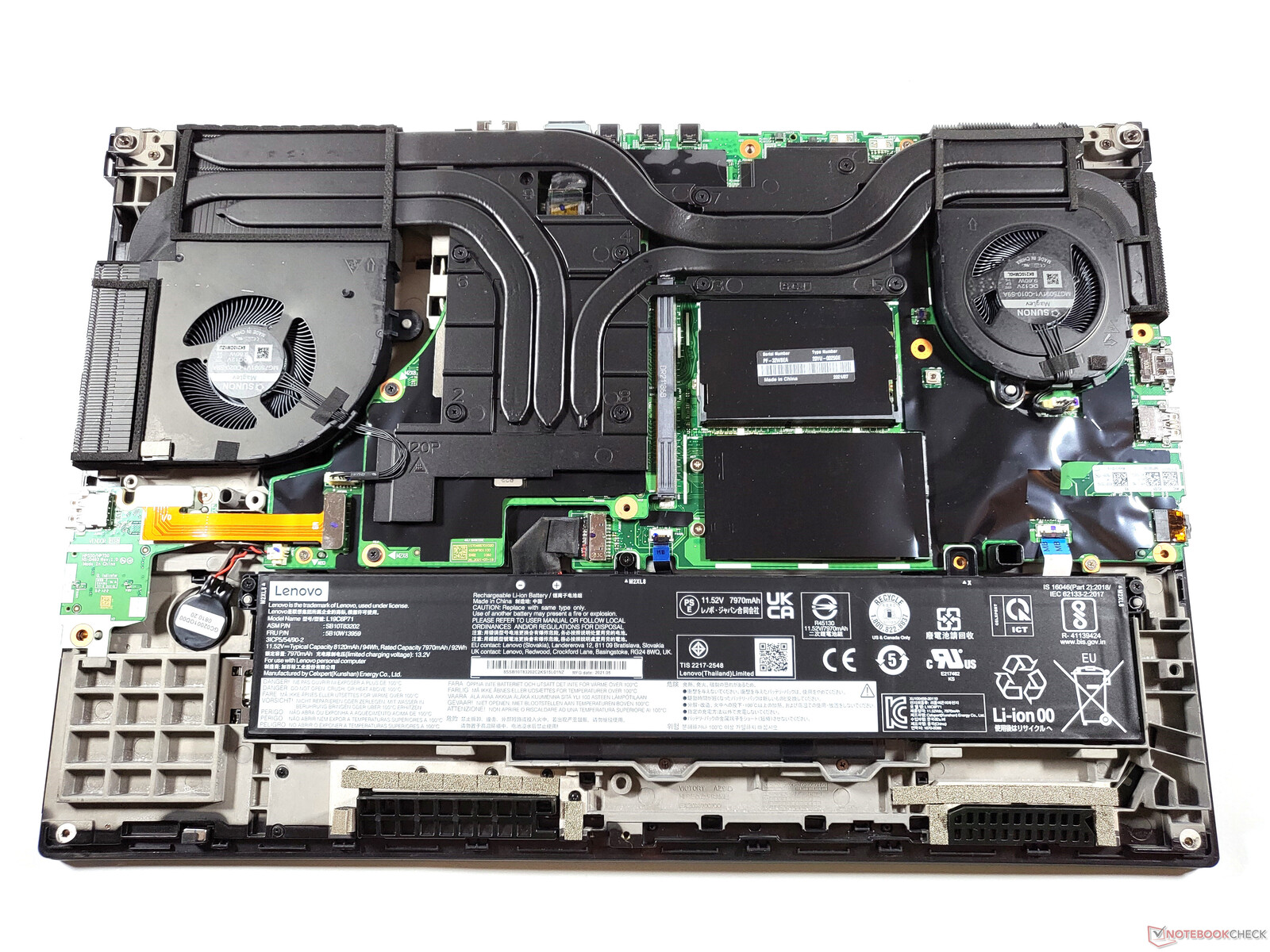 许多可升级的部件,可能难以调换--这对大多数老式的P系列ThinkPad来说都是如此。例如,为了清洁ThinkPad P73的风扇,整个机箱包括镁质框架都必须被拆开。在新的ThinkPad P17上,这种情况不再存在。拆下底板就可以接触到电池和冷却解决方案。底板上有14颗螺丝,其中两颗隐藏在小的维护舱口下面。卸下螺丝后,底板仅由塑料夹子固定。