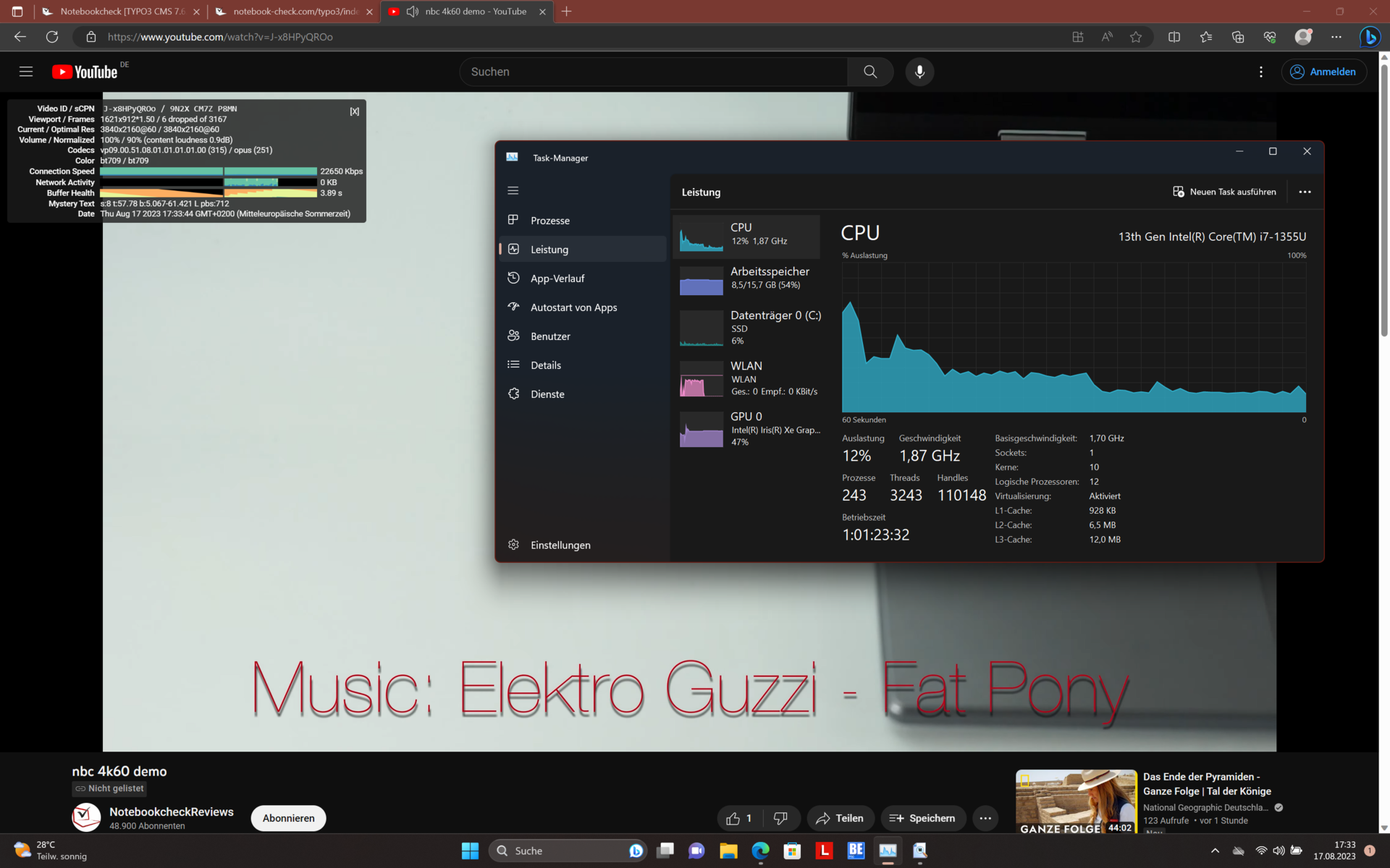 尽管电池容量为 54.7 Wh,但与 X13 Gen 3 相比,电池续航时间大大缩短。在 WiFi 测试(150 cd/m²)中,电池的续航时间不是 613 分钟,而是只有 438 分钟。原因显而易见:OLED 屏幕大大增加了耗电量。