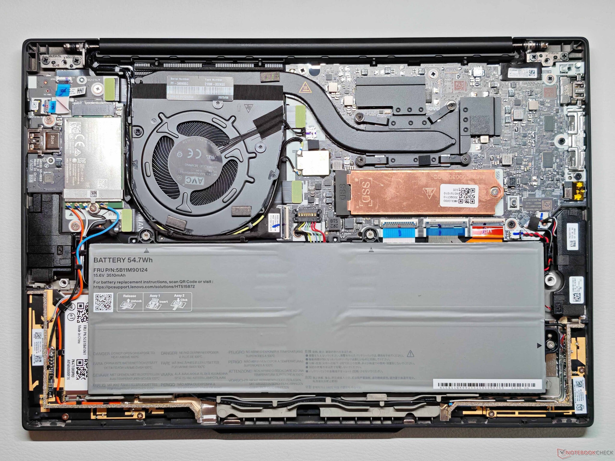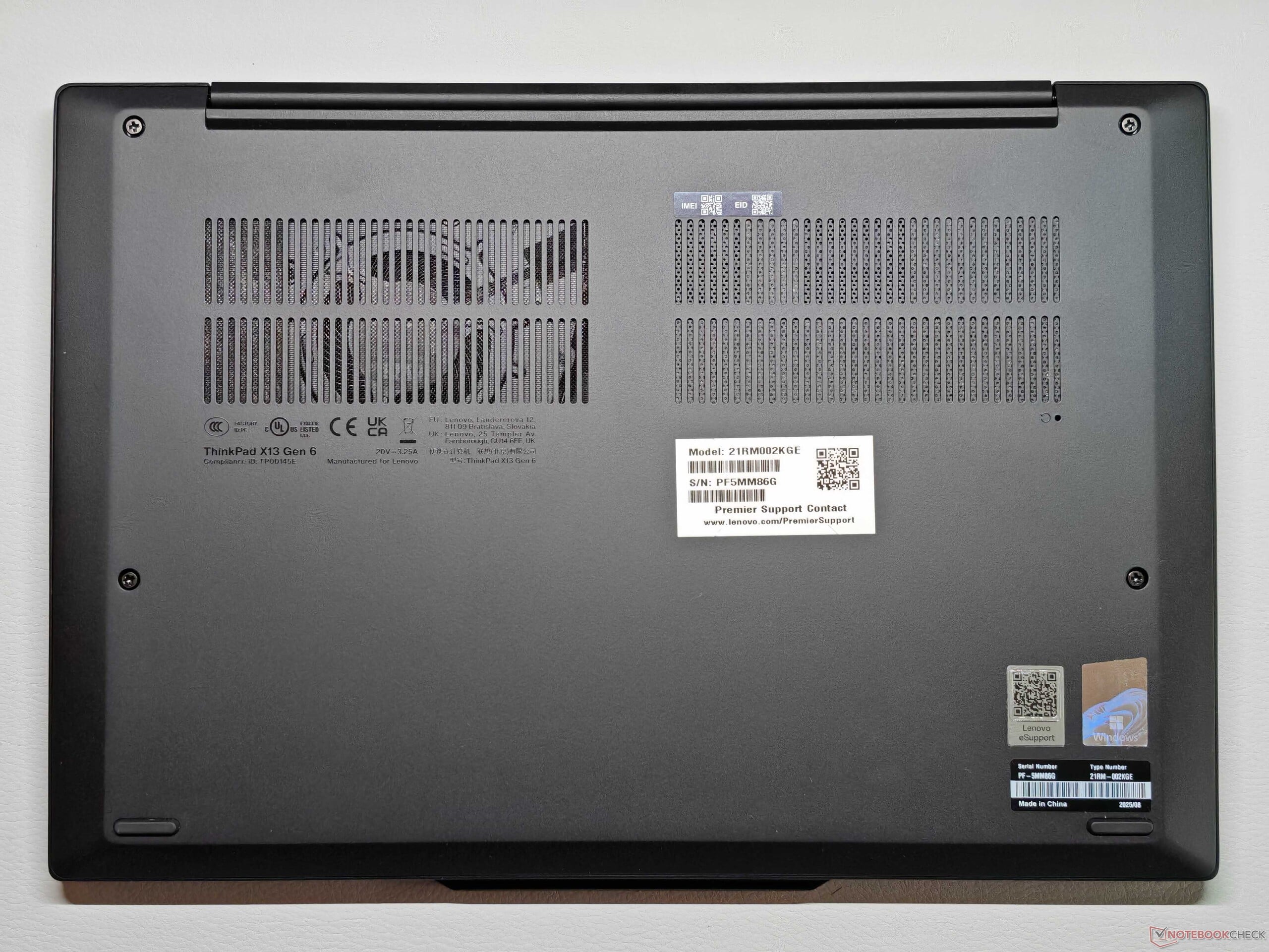 从外观上看,新款 X13 G6 无疑是一款 ThinkPad,它沿用了当前的设计语言,包括相当突出的摄像头外壳。在操作该设备时,一眼就能看出其小巧的体积和轻盈的重量。机身表面略有纹理,手感上乘,不易沾染指纹,而且相对容易清洁。盖子由碳纤维增强塑料制成,底座是铝制的。不过,对移动性的关注确实会影响到整体刚性。底座的中央区域可能会受到轻微挤压,扭动时会发出微弱的吱吱声。盖子本身还算坚固,但铰链是主要问题。最大开启角度为 180 度,但铰链有点太松,晃动得厉害。底盖只用四颗螺丝固定,很容易拆卸。风扇、电池、WWAN 模块和固态硬盘可以维修,但内存和 WLAN 模块是焊接的。