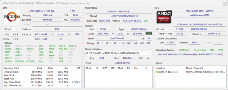 | Lenovo ThinkPad X13 G6 AMD AMD Ryzen AI 7 PRO 350 ⎘ AMD Radeon 860M ⎘ 32 GB Memory, 1024 GB SSD | Amazon: 1. $769.99 Lenovo Thinkpad E14 G6 Busin... 2. $1,150.00 Lenovo ThinkPad P14s Gen 5 A... 3. $999.99 Lenovo ThinkPad T14 Business... List Price: 1855€ | 1.1 kg | 13 mm | 13.30" 1920x1200 170 PPI IPS | |