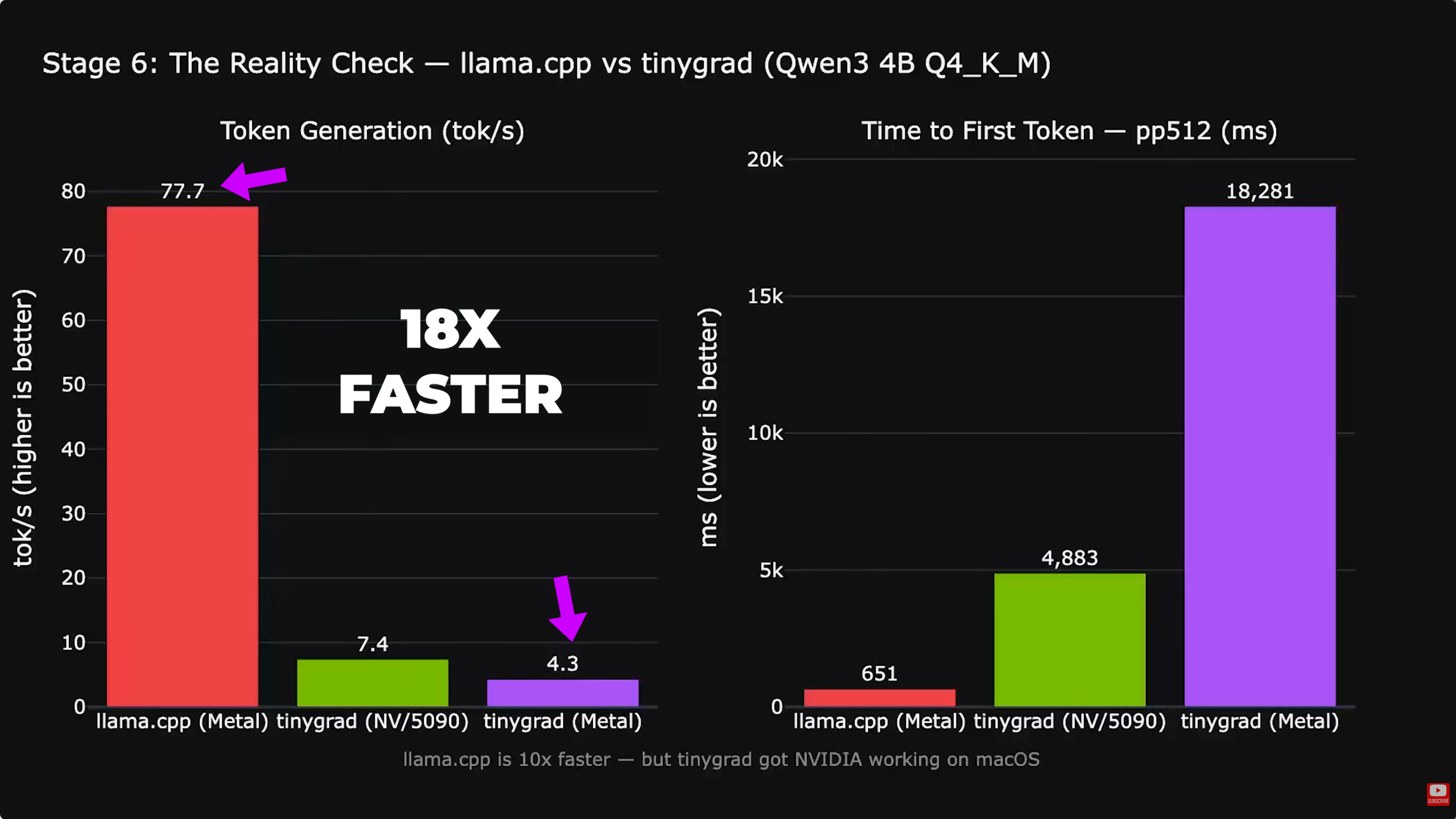 虽然连接稳定,但当前的软件栈仍处于早期阶段。驱动程序依赖于 Tiny Grad 编译器,而不是本地 Metal 或 CUDA 优化。这在繁重的计算任务中造成了性能差距。在运行Llama 3.1 8B 模型时时,该设置达到了每秒 7.48 个 token 的速度。亚历克斯说,虽然这在兼容性方面是一个很大的优势,但它仍然比金属上的原生 Llama CPP 慢,而后者在同等硬件上的速度几乎是原生 Llama CPP 的十倍。
