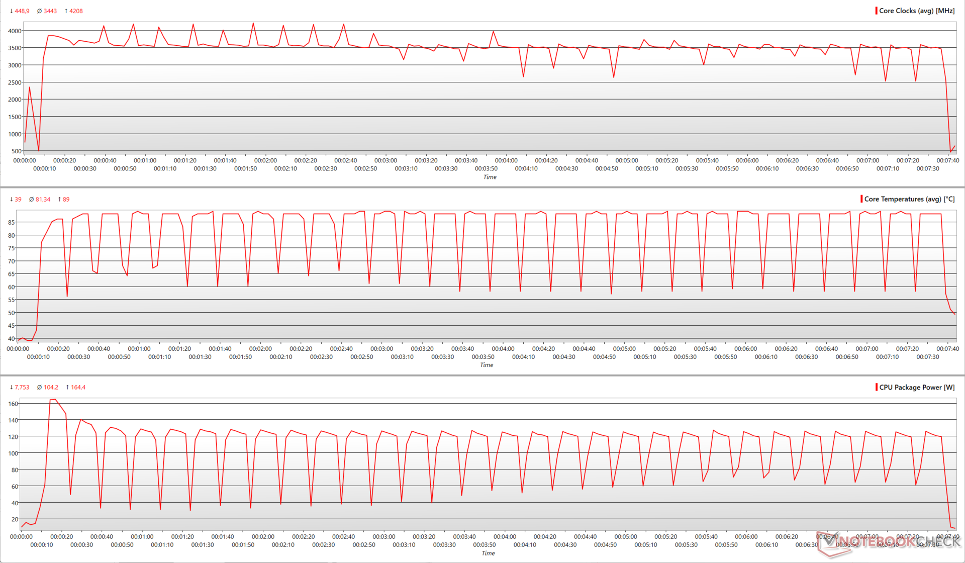 我们看到GPU在开始运行时接近175W的TGP,但在测试的主要时间内只能使用大约80-90W。在Prime95和FurMark的综合压力下,GPU的时钟并不稳定,为了适应CPU的功率要求,经常在基础时钟和提升时钟之间摆动。