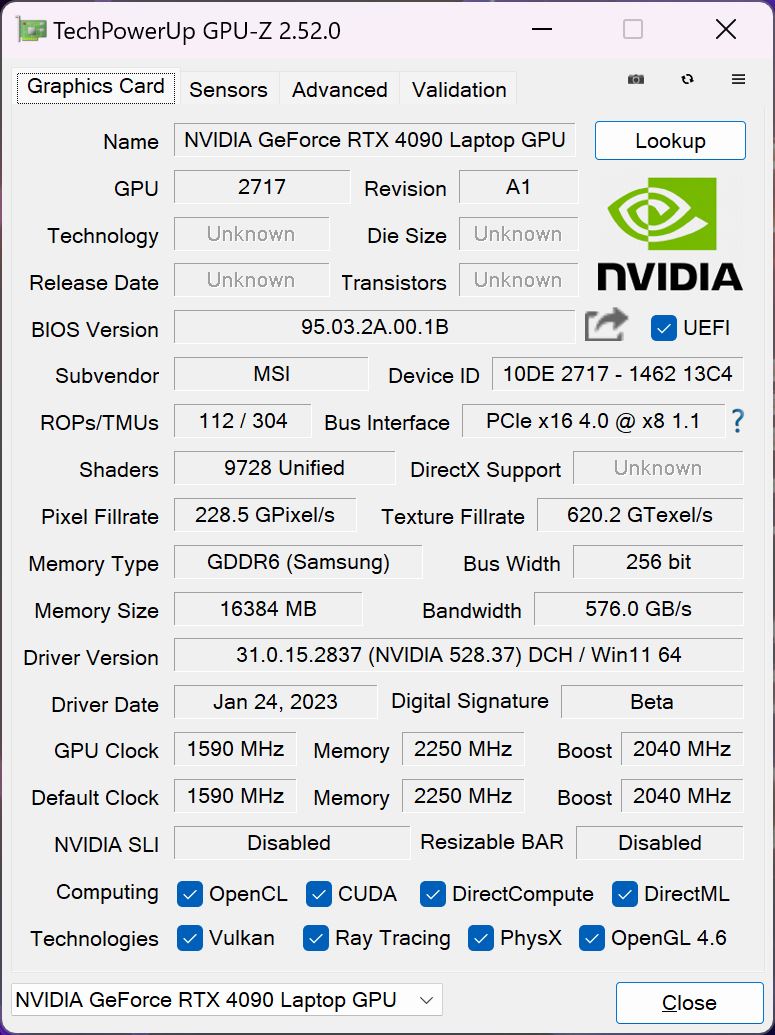 | 89 % v7 (old) | 02 / 2023 | MSI Titan GT77 HX 13VI i9-13950HX, GeForce RTX 4090 Laptop GPU | 3.5 kg | 23 mm | 17.30" | 3840x2160 | |