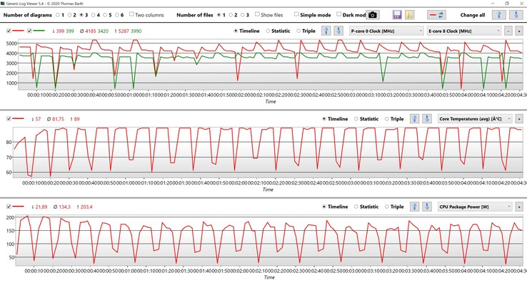 新的GT77在空转时的功耗与iGPU并不差,而且在负载下与以前的型号也没有大的差别,考虑到性能的提高,这令人印象深刻。当我们开始进行压力测试时,我们可以观察到最大消耗量高达420W,但一旦组件稳定下来,它将迅速下降到~290W。这意味着330W的电源适配器是足够的。