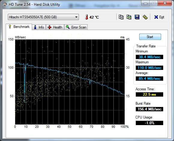 我们的TravelMate的存储设备是一个的Travelstar Z5K500 HTS545050A7E380由Hitachi。 500 GB硬盘运行在5400 RPM的旋转频率。 16 GB被保留为恢复分区。 HDTune的测量值符合我们的期望,这种类型的配置。