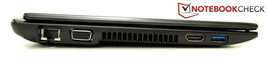 Due to the placement of interfaces, left-handers will feel considerably disadvantaged. Near the front on the left-hand side, there is a fast USB 3.0 connector and an HDMI port, followed by an air vent. At least, the VGA and Ethernet ports are located closer to the back. Considering the business audience of the TravelMate series, a docking connector would have been appreciated, but the B113 has to make do without one.