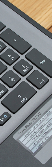 Next to the usual keys the TravelMate P273 keyboard has a numeric keypad, a Windows button and a menu button. The special keys are activated with the FN key and are spread across different areas of the keyboard. Unfortunately this appears too unsorted. The special keys for "Volume Up" and "Volume Down" are the arrow keys, yet the "Mute" button is "F8". Both the letter and numeric keys are 15 x 15 millimeters. The keyboard is completely flat and has a roughened surface. The stroke is firm and the key travel is average. The arrow keys are quite small and only have half of the height (15 x 7.5 millimeters). Under heavy pressure the keyboard can be clearly pushed in and creates some rattling noise around the "F" key. The palm rest gets warm around the touchpad, which could become unpleasant in the summer. The keyboard of the competitor Samsung 355E7C leaves a better impression.