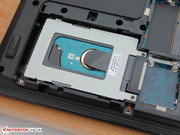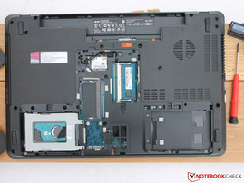 The TravelMate P273 has one large maintenance cover that almost covers half of the bottom side. The cover has to be removed very cautiously after loosening nine screws, otherwise the cover could bend or even break. After the removal you have access to the hard drive, the WLAN card, the 4 GB RAM as well as an additional memory slot. The battery can be easily removed and replaced with a slider at the case. Gaining access to the fan is not that simple so an easy cleaning is not possible. There is a second 2.5-inch bay but no second SATA port. Therefore the space for a second hard drive inside the case cannot be used.