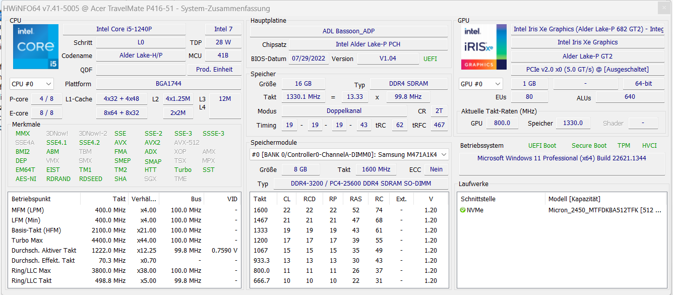 | Acer TravelMate P4 TMP416-51-55KN Iris Xe G7 80EUs, i5-1240P, Micron 2450 512GB MTFDKBA512TFK | Lenovo ThinkPad T16 G1 21CH004MGE Radeon 660M, R5 PRO 6650U, Micron 2450 512GB MTFDKBA512TFK | Lenovo ThinkPad T16 G1 21BWS00200 Iris Xe G7 80EUs, i5-1240P, Samsung PM9A1 MZVL2512HCJQ | HP EliteBook 865 G9 Radeon 680M, R7 PRO 6850U, Samsung PM991 MZVLQ512HBLU | |