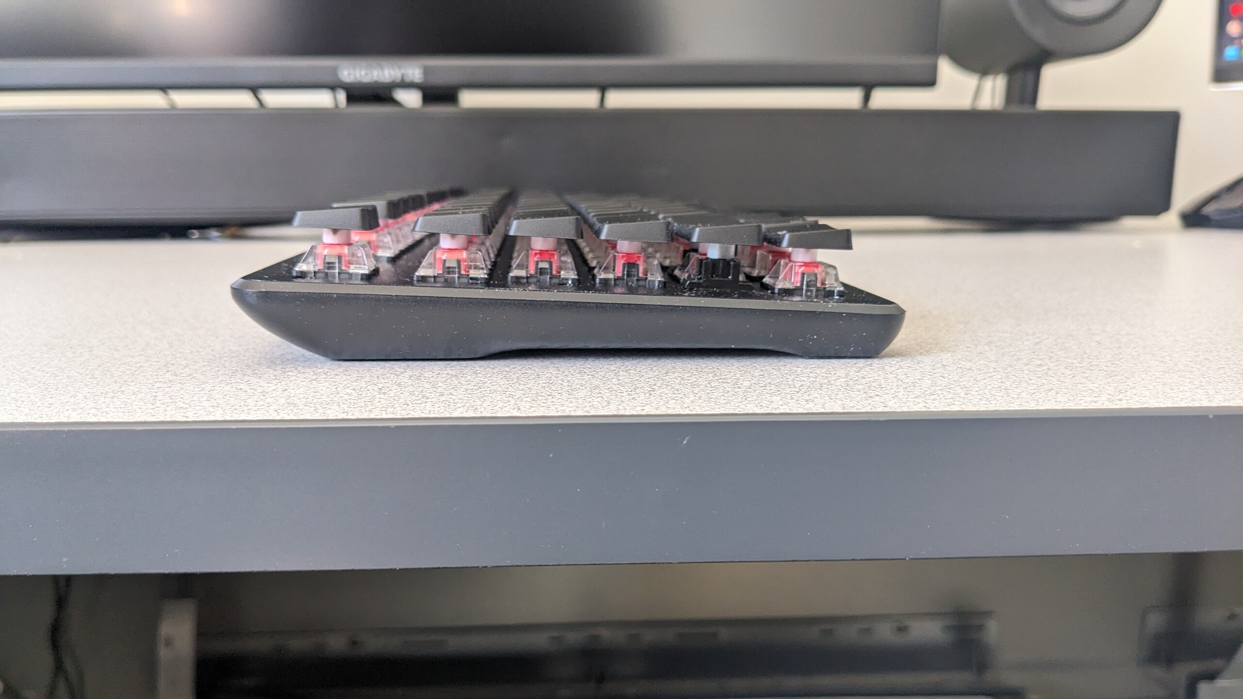 虽然其结构中使用了大量塑料,但铝制顶板可保持稳固的打字平台。ABS 键帽触感光滑,但下面的表面略有砂砾,可防止指纹沾染。