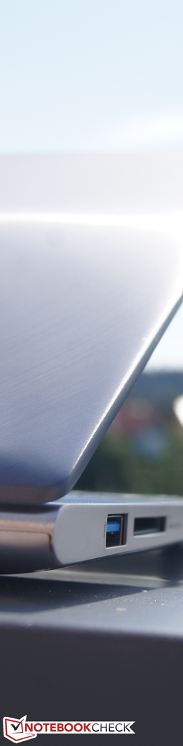 Like in the UX32VD, Asus does not install any slow USB 2.0 ports and treats our Zenbook to three USB 3.0 ports. One is located on the left and the other two on the right of the slim base unit. The ports on the right are a bit too close for comfort, but they can both recharge smartphones when the laptop is turned off (powered USB).
