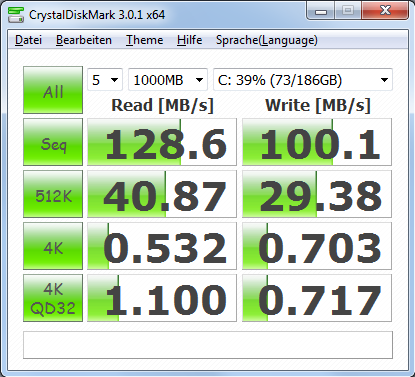 日立建500 GB硬盘(5400转),它是由一个小的32 GB SanDisk的I100补充的缓存,通常安装在这种配置。在容量方面实在是太小了,即使它有一个在HDTune的309 MB/ s的读取性能,但几乎没有任何硬盘从它时,它的好处来测量平均传输速度。因此,这也难怪,比设备,不比相差不大,只有7%(大约是的快速常规硬盘驱动器)。