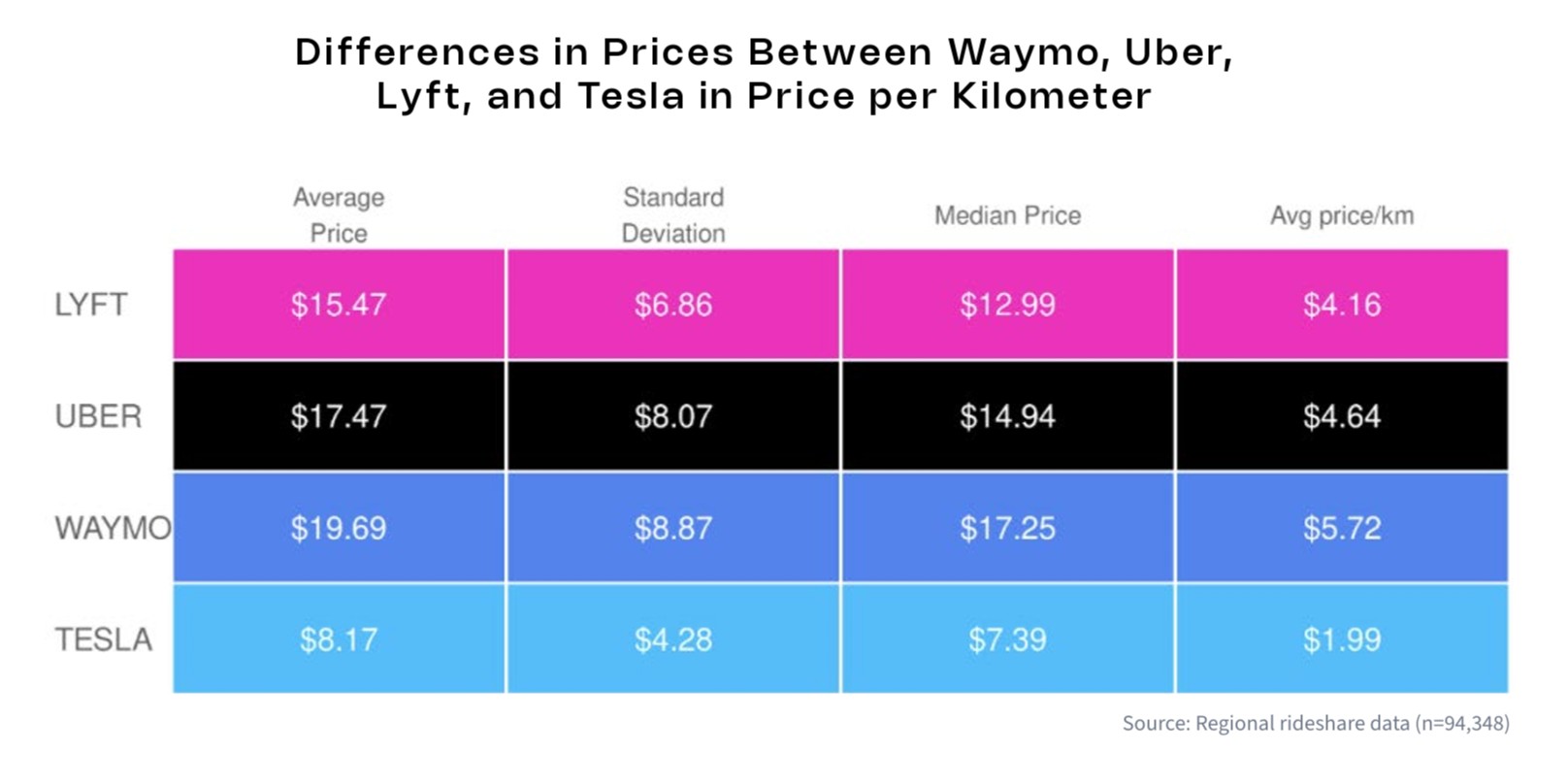 根据一项共享出行平均价格研究,特斯拉的收费仅为每公里 1.99 美元(每英里 3.20 美元),而 Waymo 的平均收费几乎是其三倍。这是94348次搭乘的平均数据,其中包括搭乘价格和各自搭乘共享服务的等待时间。