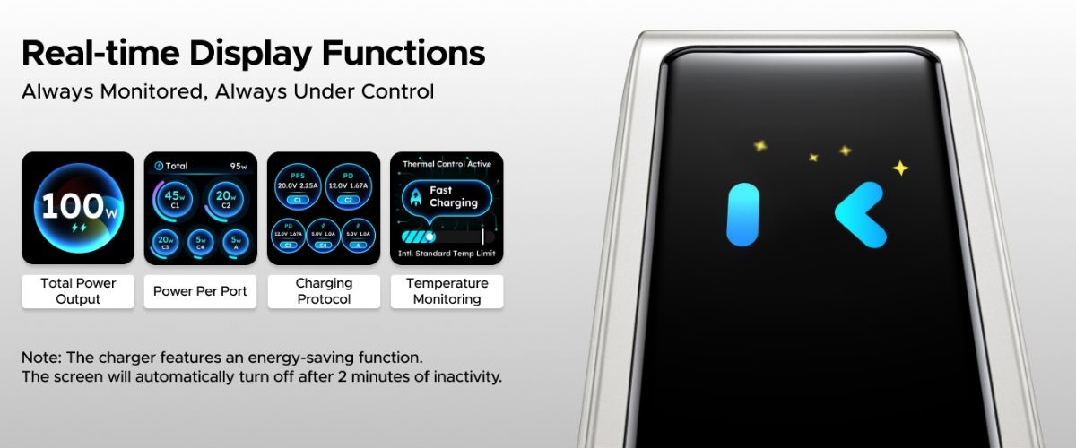 Nexode Pro 100W 充电器支持一系列协议,包括 PD 3.0、QC 4.0 和 PPS。在集成显示屏上,用户可以查看实时充电信息,如功率分配、充电协议和温度。此外,这款全新的 Ugreen 配件采用折叠式设计,使其更加小巧。