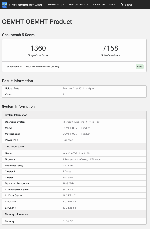 现在,罗兰-昆特(Roland Quandt)发现了 Geekbench 列表,这些列表似乎至少与两款即将推出的 Surface 产品有关。正如下面的截图所示,OEMHT 和 OEMML 有几十个条目,它们的特点是 Core Ultra 5 135U和 处理器。处理器。这两款处理器都是 Meteor Lake 处理器,由于 TDP 更高、GPU 内核增加了一倍、CPU 内核增加了两个超线程,因此后者应该比前者更强大。
