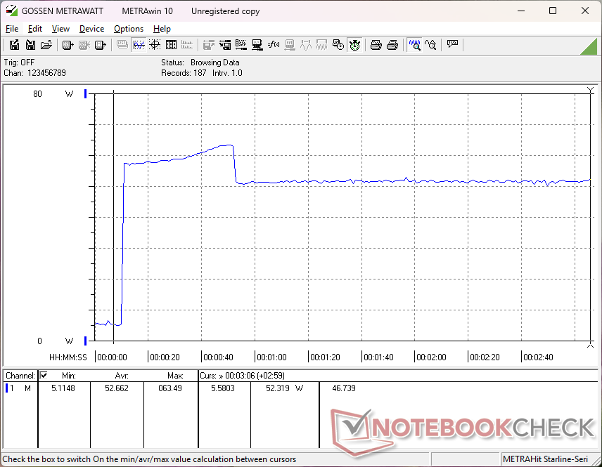 更高的负载(如游戏)需要约 49 W 的功耗,效率远高于搭载 Iris Xe 的笔记本电脑,但仍远远落后于搭载 Radeon 890M 的替代产品,如ZenBook S16 。