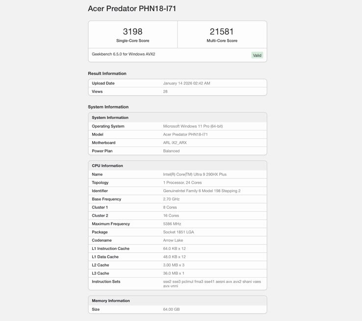 Core Ultra 9 290HX Plus 的 Geekbench 6 单线程成绩为 3,198 分,多核成绩为 21,581 分,在这一基准测试中已分别比 Core Ultra 9 285HX 快了 5.6% 和 4.6%。因此,性能的巨大飞跃并不出人意料,因为新处理器与老款 Arrow Lake 芯片基于相同的架构。