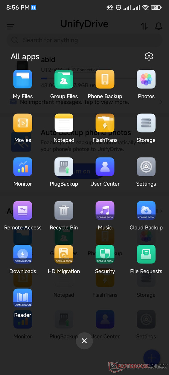 打开后,配套应用程序会引导你完成账户创建和注册过程,一切设置完成后,你就可以开始备份数据了。这款便携式 NAS 在 UnifyDrive 的定制操作系统 UDOS 上运行。UnifyDrive 在操作系统中集成了许多与数据备份相关的应用程序,不久还将添加更多应用程序。