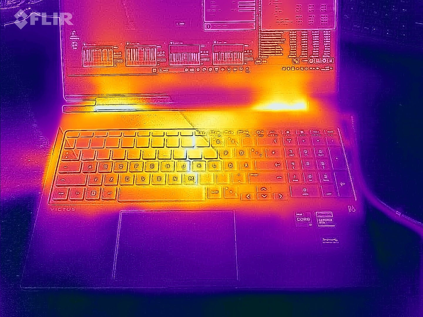 (+) The palmrests and touchpad are reaching skin temperature as a maximum (33 °C / 91.4 F) and are therefore not hot.