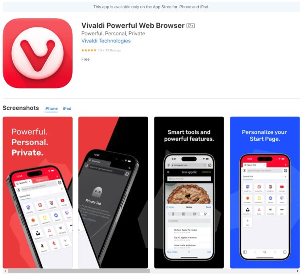 虽然 Vivaldi 才在 App Store上架三天上架三天,Vivaldi 已获得 76 条用户评论,总体评分为 4.7/5。当前版本的下载大小为 173.9 MB,系统要求为 iOS 15.0 或更高版本,适用于 iPhone、iPad 和iPod touch。.