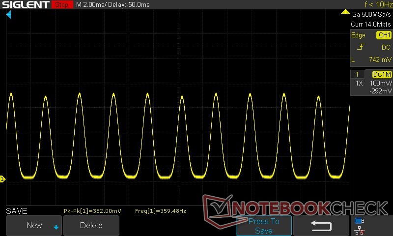 华硕在 VivoBook 14X 中使用了 2.8K 90 Hz 三星 OLED 面板,为新进编辑人员提供了出色的色彩特性。该面板在较低亮度水平时受到 PWM 的影响,但在较高照度下使用 DC Dimming 可以在一定程度上补偿闪烁。