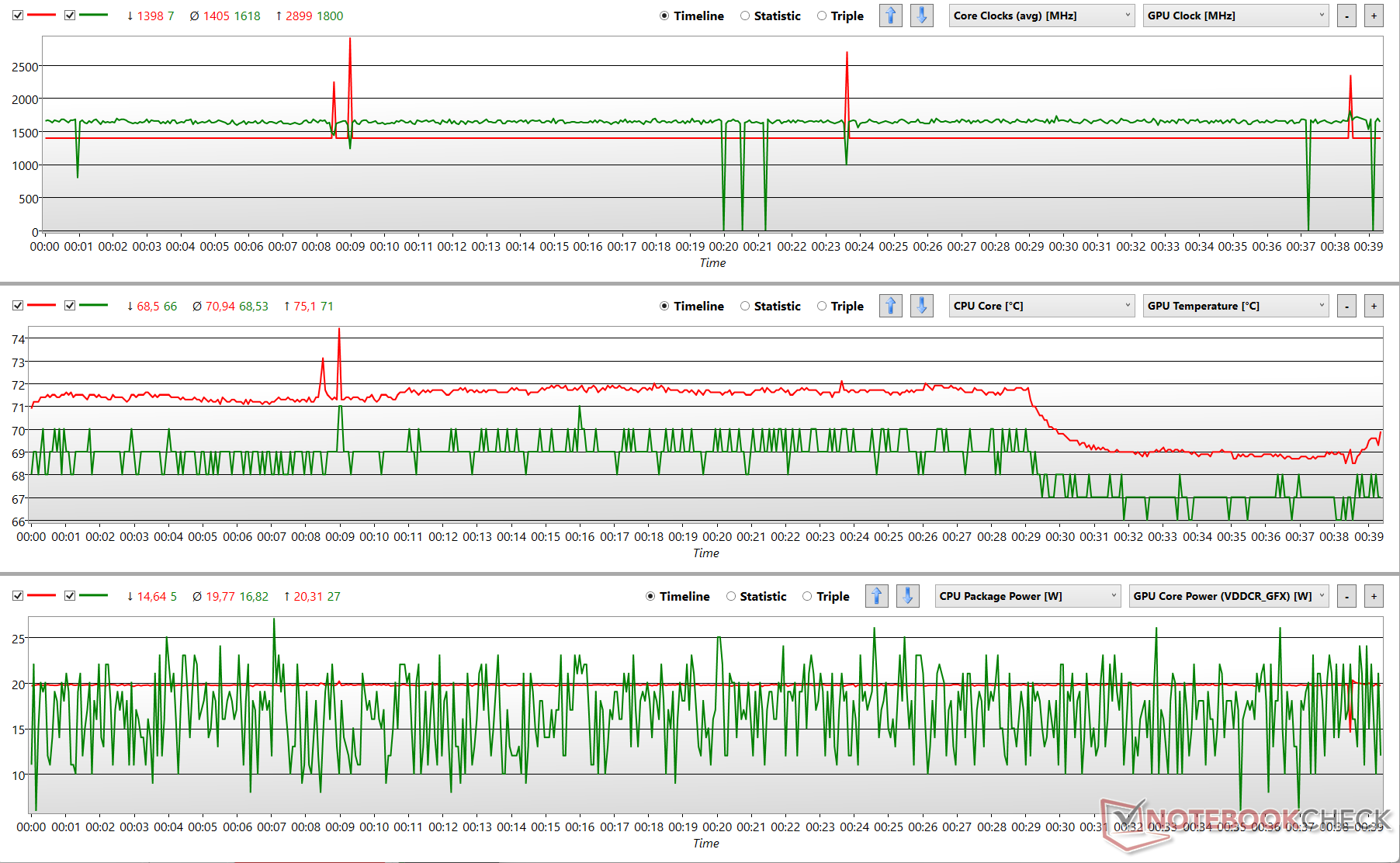 改变到性能模式再次有利于CPU的性能,尽管GPU的性能没有受到很大影响。我们看到CPU时钟现在在2.5GHz和3GHz之间震荡,而功率包络从20W增加到25W。GPU核心功率也得到了增加,但分配非常不稳定,不像CPU使用的25W那样稳定。