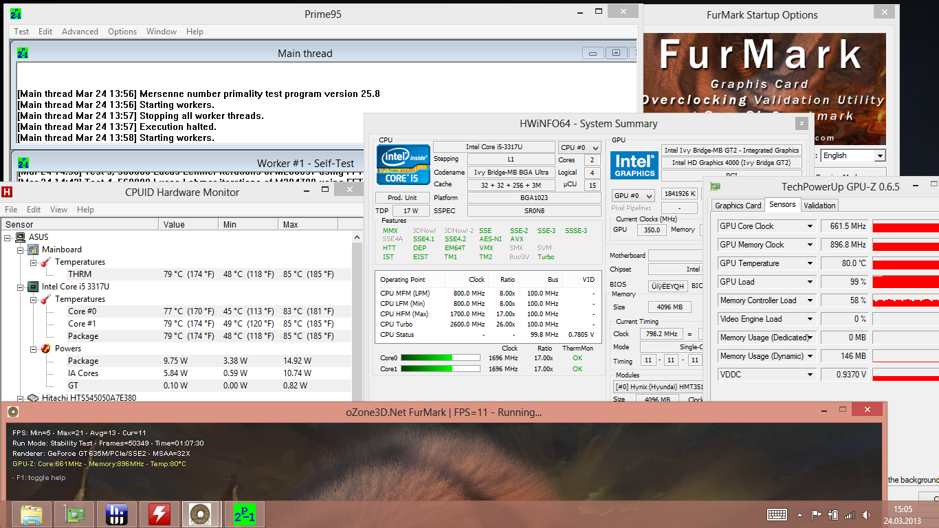 因此,我们很好奇,并通过一系列的基准派睿i5-3317U。正如预期的那样,结果是这款处理器的类型和典型的平均范围内稍微落后可比标准电压型号,像往常一样。我们监测的时钟速率,另外HWiNFO“的工具,它证实了英特尔的Turbo Boost的活动期间的Cinebench渲染。它不记录CPU的最大时钟速率为2.6 GHz,但一致的2.4 GHz的,而不是。这显然是其预设时脉为1.7 GHz以上。电池供电的结果分歧。虽然在CPU也时钟与电池上所有电源,并因此达到同样的分数在交流模式下,GPU的时钟速率之间的最大和空闲时钟率的135 MHz(核心),405兆赫(存储器),并从而只实现约波动50%的OpenGL测试中的表现。