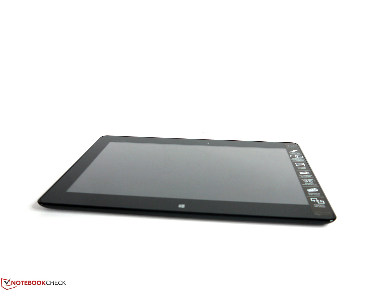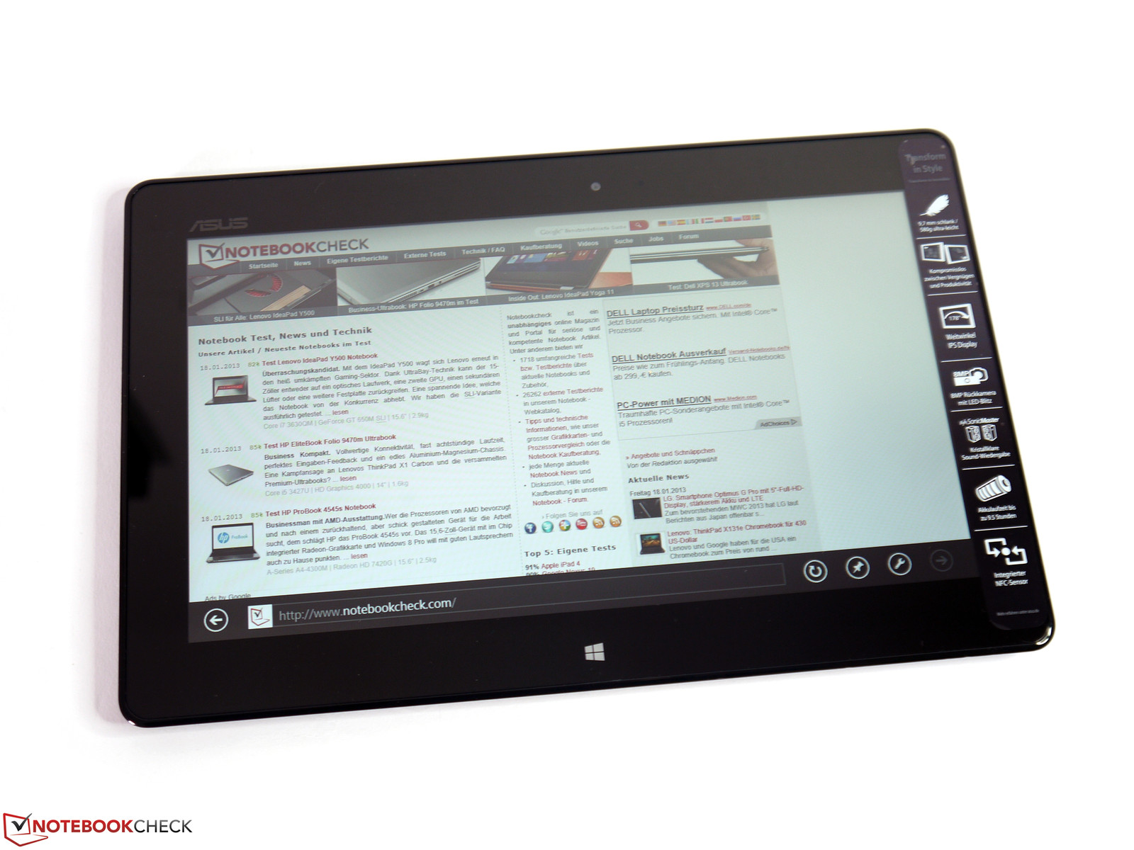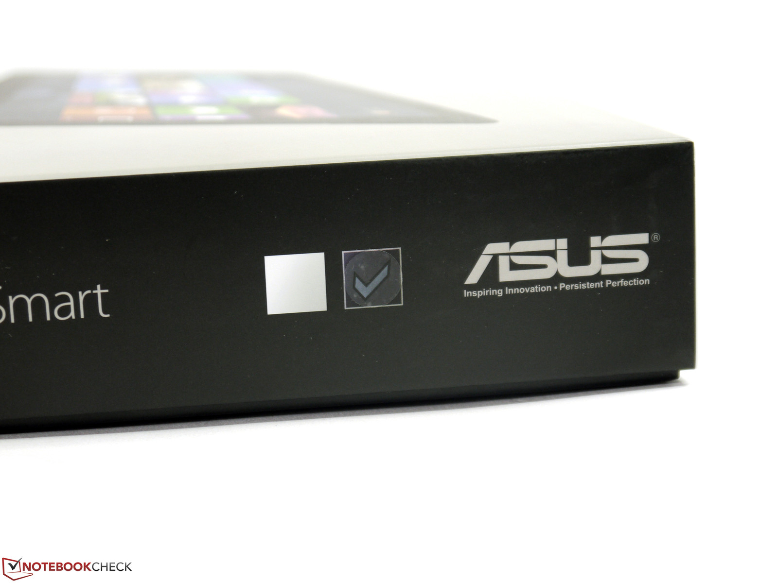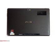 The screen side is a big glass surface that takes up the casing's entire width. Besides the 2 megapixel webcam, the brightness sensor and the Windows sensor button, the black frame exhibits an unobtrusive Asus logo in the upper left corner. All of this is enclosed by a narrow, glossy black frame. The casing's stability is good although it cannot compete with contenders like the iPad 4 or Asus' Transformer Pad TF700T. The casing only warps marginally and responds to this with a quiet creaking noise. Asus' VivoTab is also available in white. There is even a red version mentioned in the specs on Asus' US homepage.