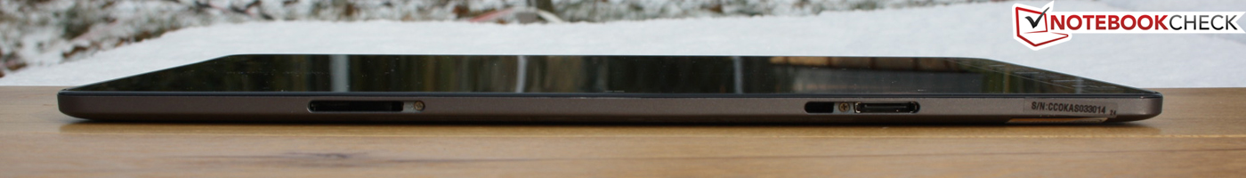 Micro-SD cards (microSDHC and microSDXC) can be used to expand the memory. The Envy X2 offers more ports in total with a full size SD card reader and HDMI (standard) but drops the micro-HDMI port at the tablet. We think the HP solution is more practical because you do not need an adaptor and a display is connected at the office most of the time anyway. When our VivoTab is used as a laptop it is very hard to attach the HDMI cable. It would hang free and cause the device to tip over. Similar to our review unit the W510 and ATIV Smart PC only have the card reader and HDMI (in each case micro) at the tablet.
