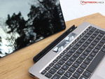 The opening angle of the cover is limited to around 130 degrees and the heavy base unit (weight of the second battery) avoids tipping backwards. Touch inputs encounter a usable fixated surface but the wobbling within the joint is disturbing. The Samsung ATIV Smart PC and HP Envy X2 have the same problem. Especially problematic for Samsung users: The opening angle is smaller, the device can tip due to the unfavorable center of gravity (no battery weight underneath the keyboard) and the display falls back onto the keyboard by itself (no fixation point).