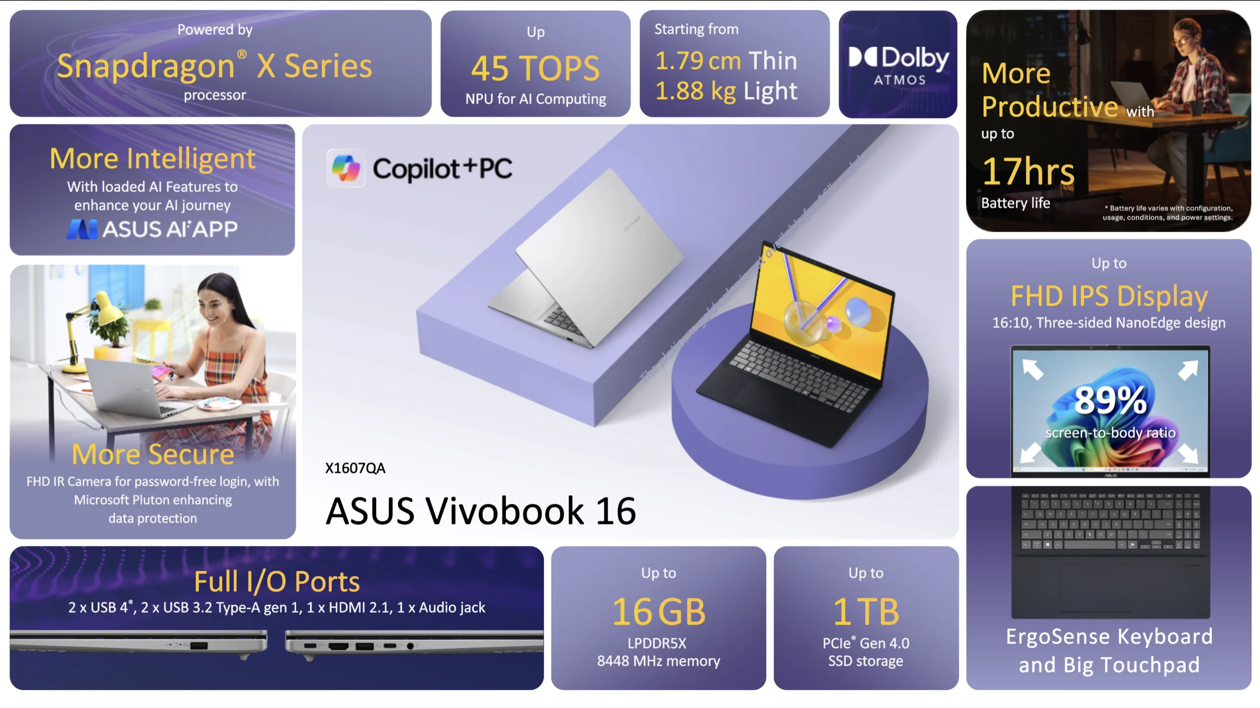 华硕在今年的消费电子展(CES)上带来了全新的 Vivobook 16 机型,该机型配备了新一代 AMD 和高通处理器,以及最新一代的 Vivobook S 机型.更确切地说,华硕 Vivobook 16 现在可在 AMD Ryzen AI 7 445 和高通 骁龙 X 系列处理器。遗憾的是,华硕尚未透露高通芯片组的确切名称。