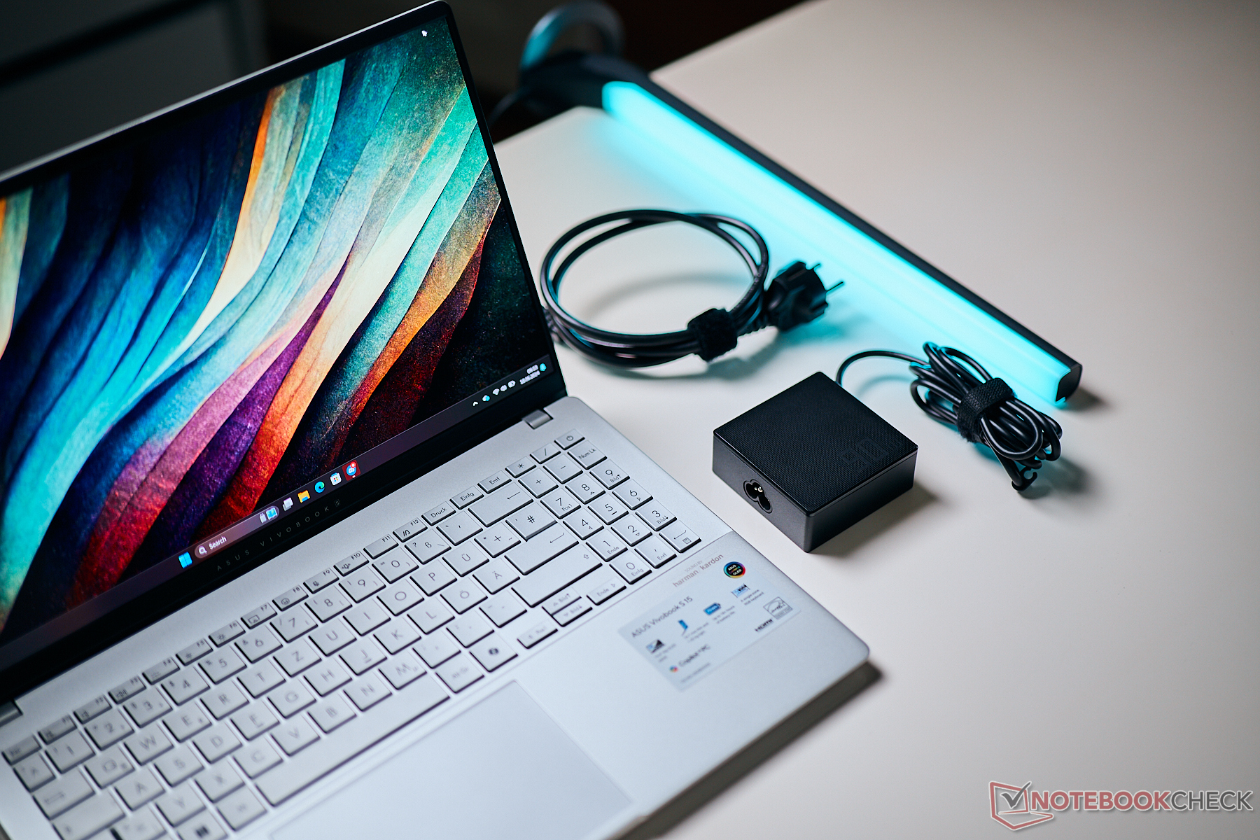 我们已经谈到了 AMD/Intel 机型与 Vivobook 之间的尺寸差异。同样是 15 英寸的 MacBook Air 稍微深一些,但反过来又窄一些(这主要与长宽比不同有关)。当然,16 英寸设备在桌面上占据的空间更大一些。新款 Vivobook 重 1.43 千克,比 MacBook Air 15(1.5 千克)稍轻。附带的 90 瓦电源线又增加了 392 克的重量。