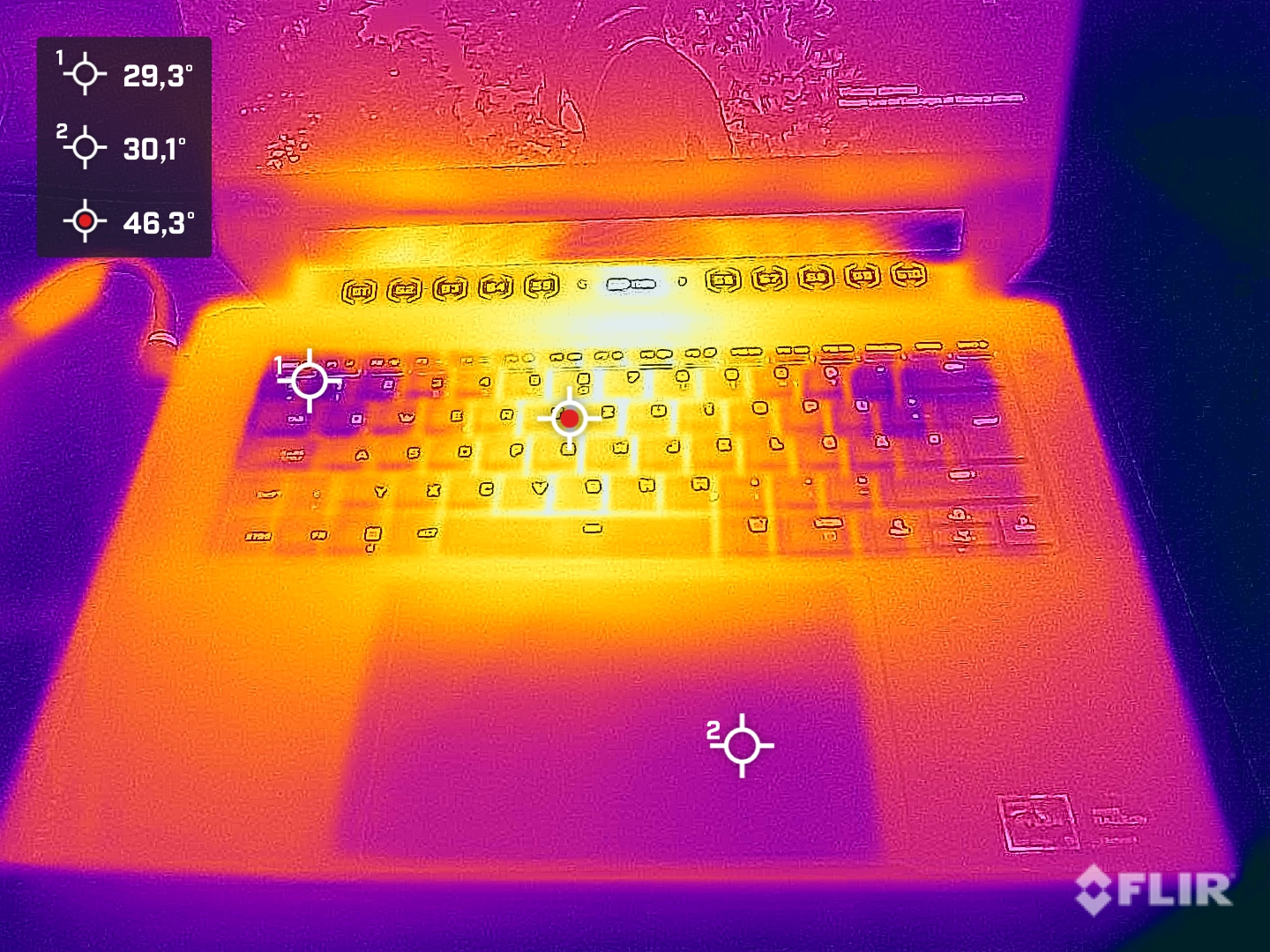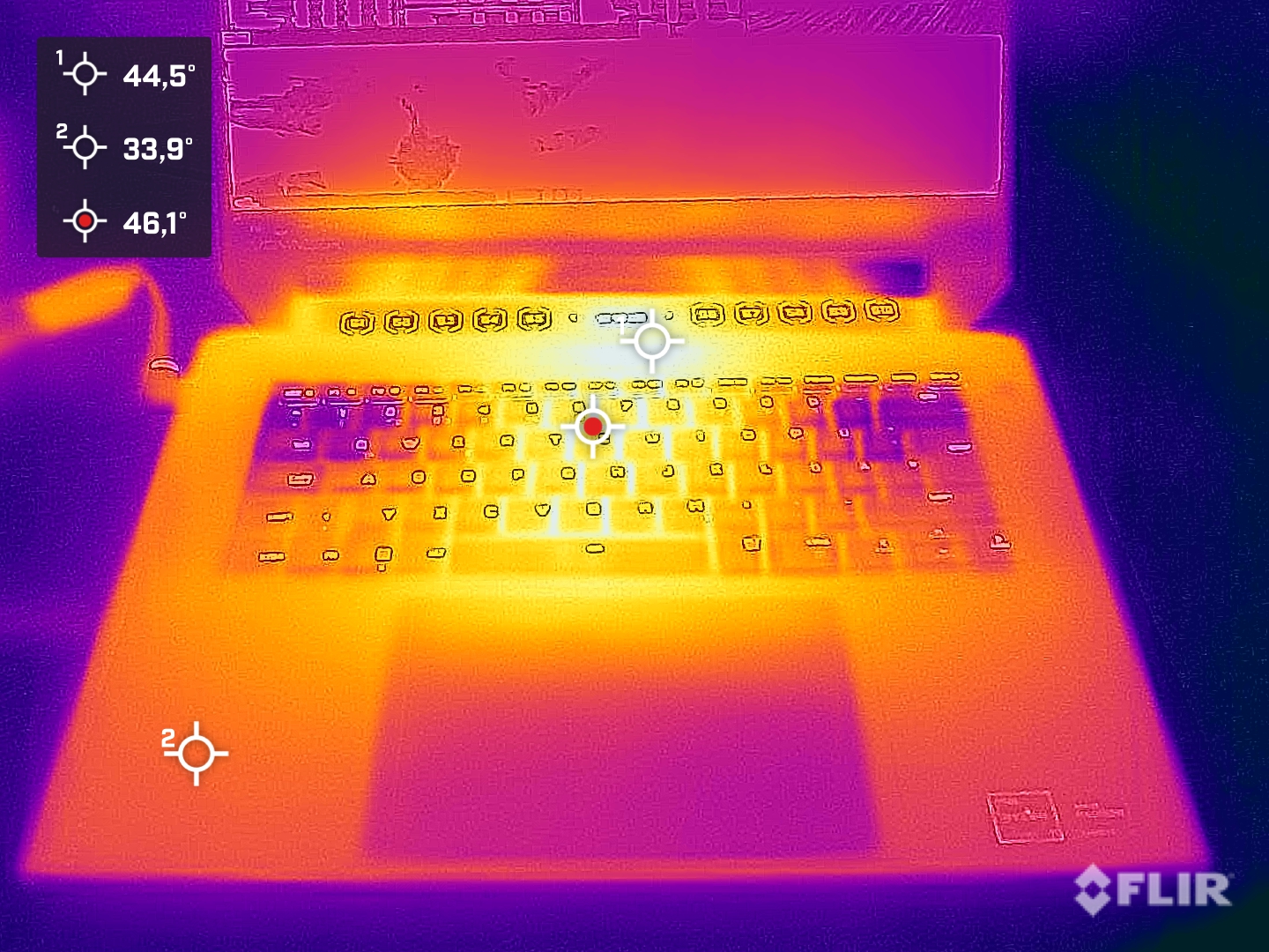 (+) The palmrests and touchpad are reaching skin temperature as a maximum (34 °C / 93.2 F) and are therefore not hot.