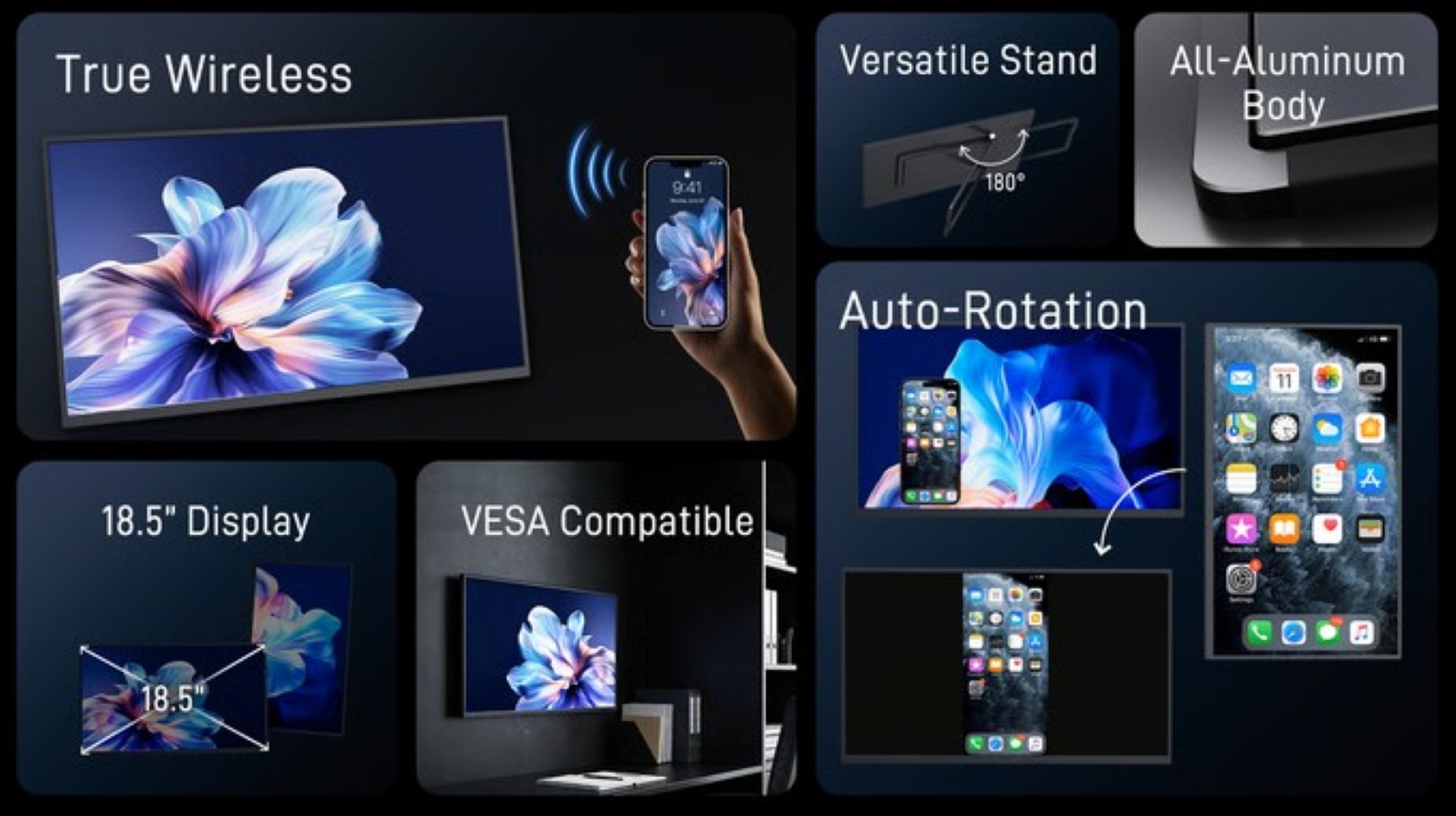 该公司强调了安装显示器的多种方法,包括通过 75x75mm VESA 支架或内置脚架。它还支持纵向和横向。虽然 Vuelim 可以通过 USB-C DisplayPort 和 HDMI 接口作为传统的有线显示器使用,但它的主要功能仍然是通过 5GHz Wi-Fi 模块实现无线功能,使其能够无线连接到 Windows、macOS、Android 和 iOS 设备。