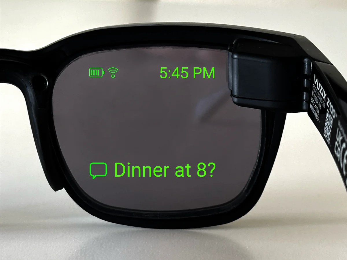 Z100 智能眼镜有透明或有色镜片可供选择,并可配光。这款可穿戴设备提供透明的波导显示屏,让你可以查看实现健身目标的进度、跑步速度、谷歌地图(仅限Android )的逐向导航和通知等信息。通过蓝牙连接,您可以将眼镜与各种 iOS 和Android 智能手机无线配对。您可以使用 Vuzix Connect 应用程序配置小工具,并访问文本翻译等其他功能。此外,这款可穿戴设备在两次充电之间可运行长达 48 小时,该公司称这款眼镜佩戴舒适,重量超轻,仅重 38 克(约 0.06 磅)。