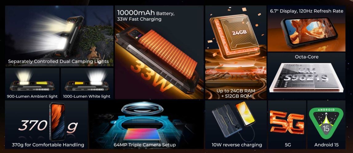 无论如何,这款 Oukitel 智能手机都配备了 10,000mAh 电池,充电功率可达 33 瓦。它还支持 10 瓦反向充电,因此可以像移动电源一样使用。此外,WP58 Pro 搭载的 SoC 有 8 个内核,支持 5G,因此它不像其他廉价耐用智能手机那样仅限于 4G LTE。其余规格包括 8GB 内存,而 512GB 的大容量存储空间也很合理。这款手机开箱即可运行Android 15,用户可以通过 microSD 扩展存储空间,只需牺牲一个双 SIM 卡插槽即可。