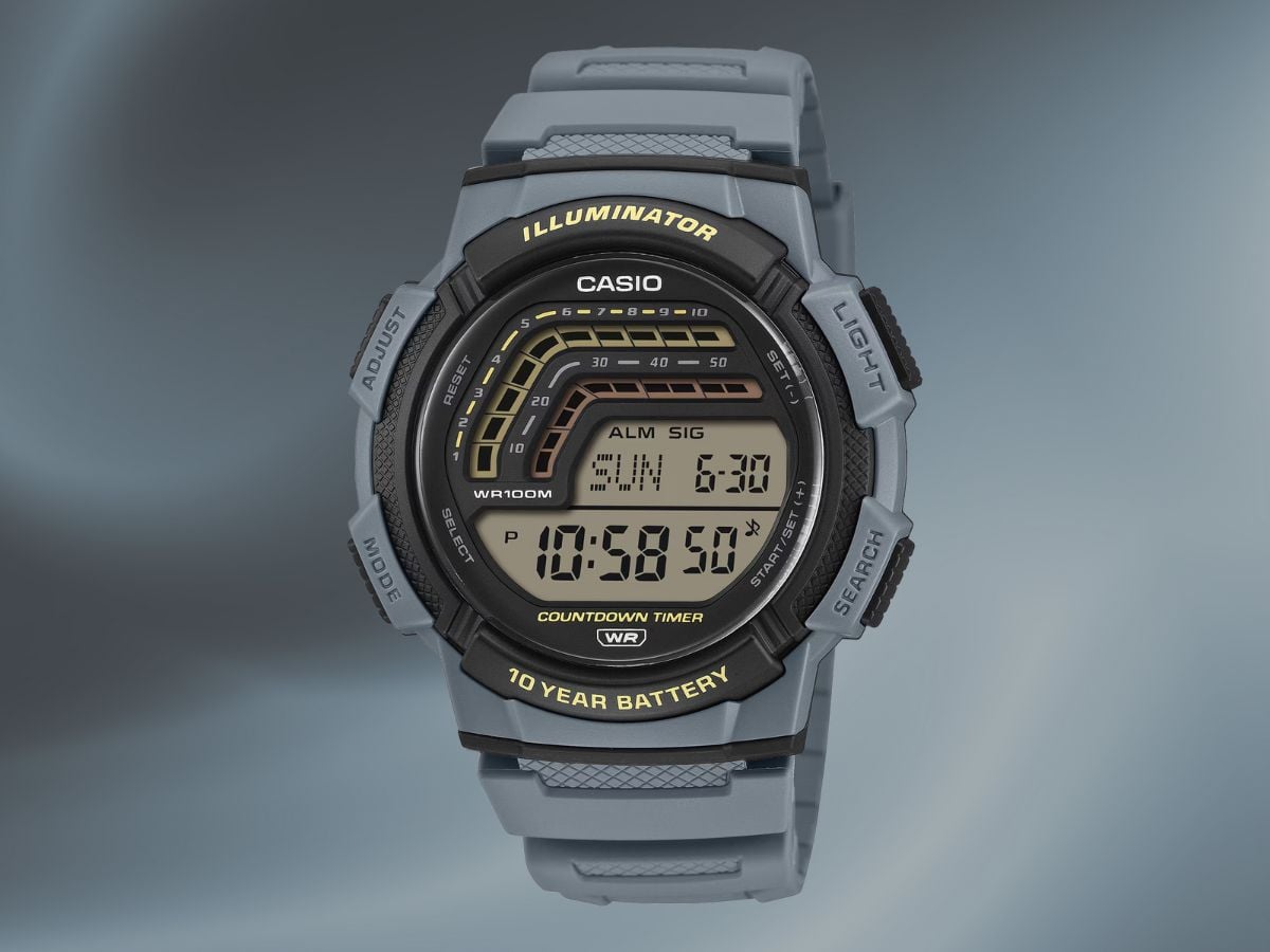 卡西欧 WS1800 被描述为一款具有 "复古风格的大型图形显示 "的多功能数字手表。手表表面的顶部是两个刻度,据说这样可以更方便地读取倒计时器或秒表。下面是一个较大的浅色背景显示屏,显示时间、日期和星期。