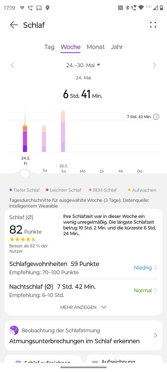 华为 Watch Fit 3 的睡眠追踪功能非常广泛。一方面,软件提供了总睡眠时间和各个睡眠阶段的概览。手表可以区分浅睡眠、深睡眠和快速眼动睡眠。还能识别觉醒阶段。各个阶段在时间轴上可视化显示。
