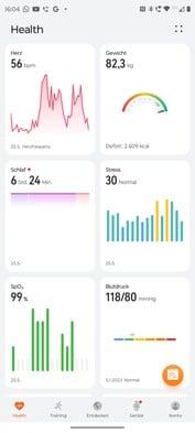 该应用程序分为五个部分:健康"、"培训"、"发现"、"设备 "和 "帐户"。"健康 "是一个仪表盘,以卡片的形式显示所有收集到的数据。按下卡片可打开相应的子菜单。