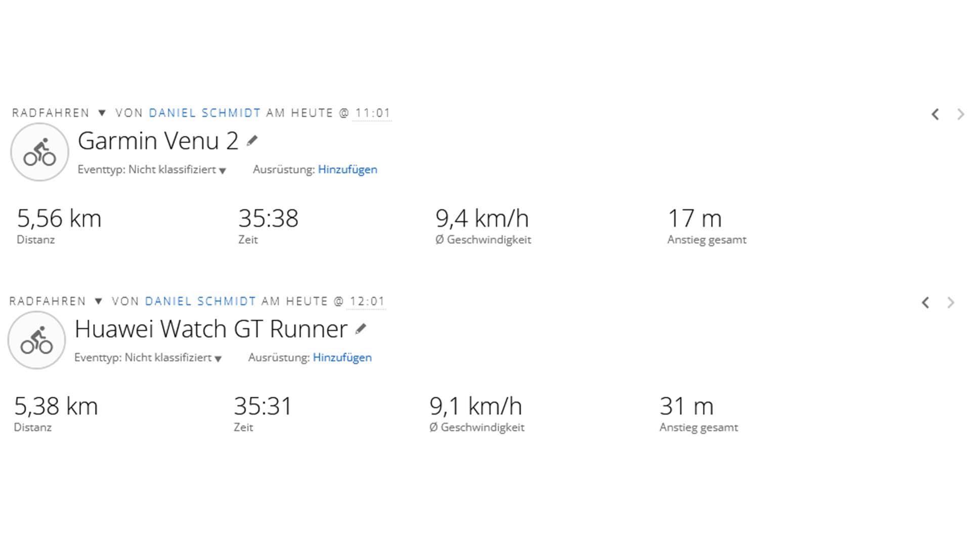 得益于双频GNSS,华为手表在开始锻炼时能非常迅速地找到GPS连接。除了GPS,该手表还支持北斗、格洛纳斯、伽利略和QZSS。测量的准确性是令人信服的。在五公里(约3.1英里)的自行车圈中,与Garmin Venu 2参考设备的偏差只有18米(约59英尺)。此外,GT Runner还可以通过其气压计显示覆盖的海拔米数。