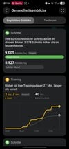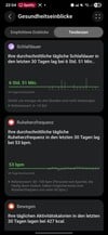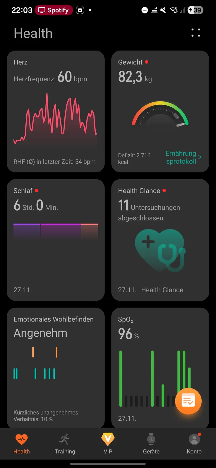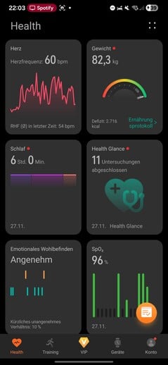 健康 "应用程序分为五个部分:健康"、"训练"、"VIP"、"设备 "和 "账户"。健康 "选项卡是所有记录的生物识别数据的仪表盘,以可定制的磁贴形式显示。